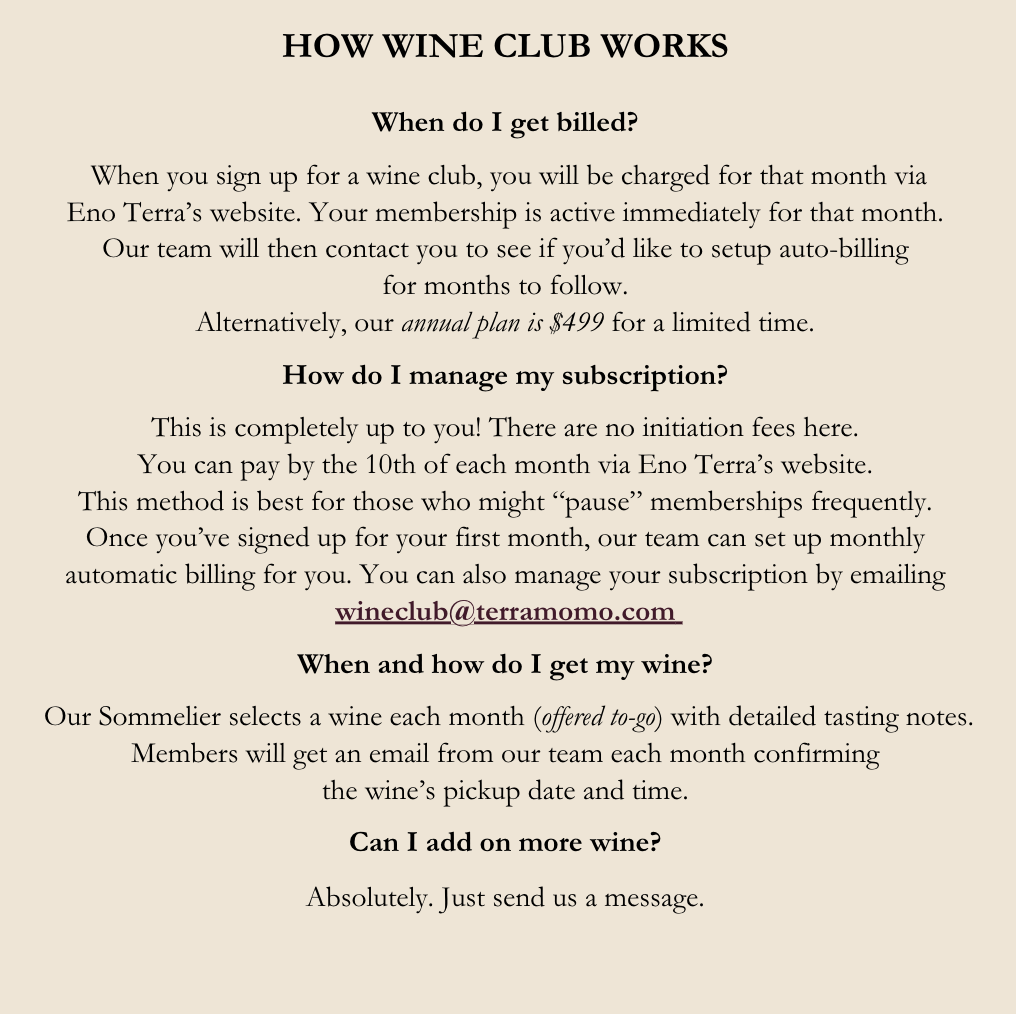 2025 WINE CLUB December 31 2025 | 12:00 AM - 12:00 AM 4484 NJ-27, Kingston, NJ 08528 Purchase Tickets $499.00 1 ticket maximum per purchase. Please, select a ticket type Ticket Type* Ticket Type ANNUAL WINE CLUB - $499.00 Please, enter a valid first name First Name* Please, enter a valid last name Last Name* Please, enter a valid email Email* Please, enter a valid requested bottle pick up day (enter date) REQUESTED BOTTLE PICK UP DAY (ENTER DATE)* Add Ticket To Cart Please check errors in the form above.