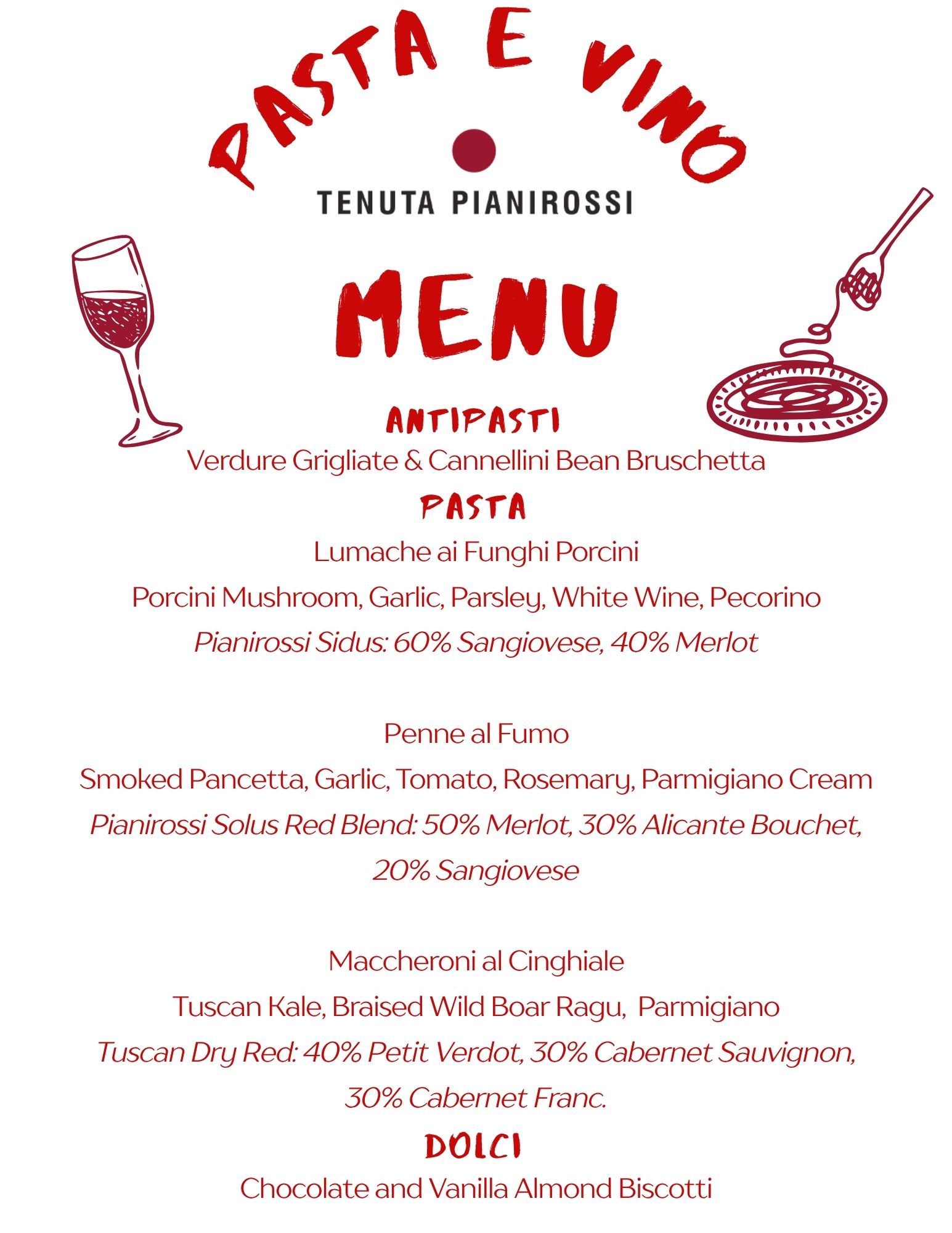 An evening of exquisite pasta and exceptional Tuscan wines. From earthy porcini to smoky pancetta to tender braised wild boar, each course is thoughtfully paired with a Pianirossi wine. Book now-- our Pasta e Vino dinners always sell out!